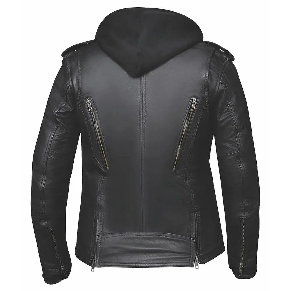 Giacca con cappuccio ventilata Premium da donna di Road Breed. Realizzata in pregiata pelle di agnello nel classico nero, questa giacca unisce un design moderno con cappuccio a caratteristiche premium per comfort, protezione e praticità.
